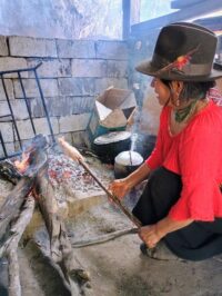 Ondanks dat het leven van de boeren dus niet altijd makkelijk is, blijven de landbouw en veehouderij het fundament van de economie in de Andes. Er zijn tientallen markten in de buurt waar boeren hun vee en producten verkopen, zowel in de dorpen als in de hoofdstad Riobamba. De markt is een van mijn favoriete plekken om te komen, omdat er altijd veel leven is. Mensen kletsen met elkaar, er wordt heerlijk eten bereid, en je leert er elke keer wel weer een nieuwe soort groente of fruit kennen. Heb jij bijvoorbeeld al eens gehoord van melloco, chocho, of naranjilla? Met een economie die draait om het produceren van voedsel, zal het je ook niet verbazen dat de Ecuadorianen dol zijn op lekker eten. Op elke hoek van de straat vind je restaurantjes en eetkraampjes waar maaltijden als hornado, humitas, encebollada of seco de pollo te vinden zijn. Niet alleen buiten de deur, maar ook binnenshuis staat eten centraal. Het samen bereiden en delen van maaltijden is echt een onderdeel van de Ecuadoriaanse cultuur, en in de Andes is vooral cuy con papas (cavia met aardappelen) favoriet! Samen met de familie in de páramo waar ik een tijdje verbleef, maakte ik dit maaltje klaar. Ik had (ehm) de eer om zelf een cavia uit de schuur uit te kiezen, het beestje mee om zeep te helpen, en te bereiden samen met mijn `mama´. Hoewel het bereiden en proberen van de cuy best een stap was voor iemand die normaal geen vlees eet, kon ik natuurlijk niet anders dan het proberen! Uiteindelijk was het een prima maaltijd. Alhoewel ik niet weet of het mijn nieuwe favoriete eten is, maar dat vertelde ik mijn `mama´ stiekem maar niet…